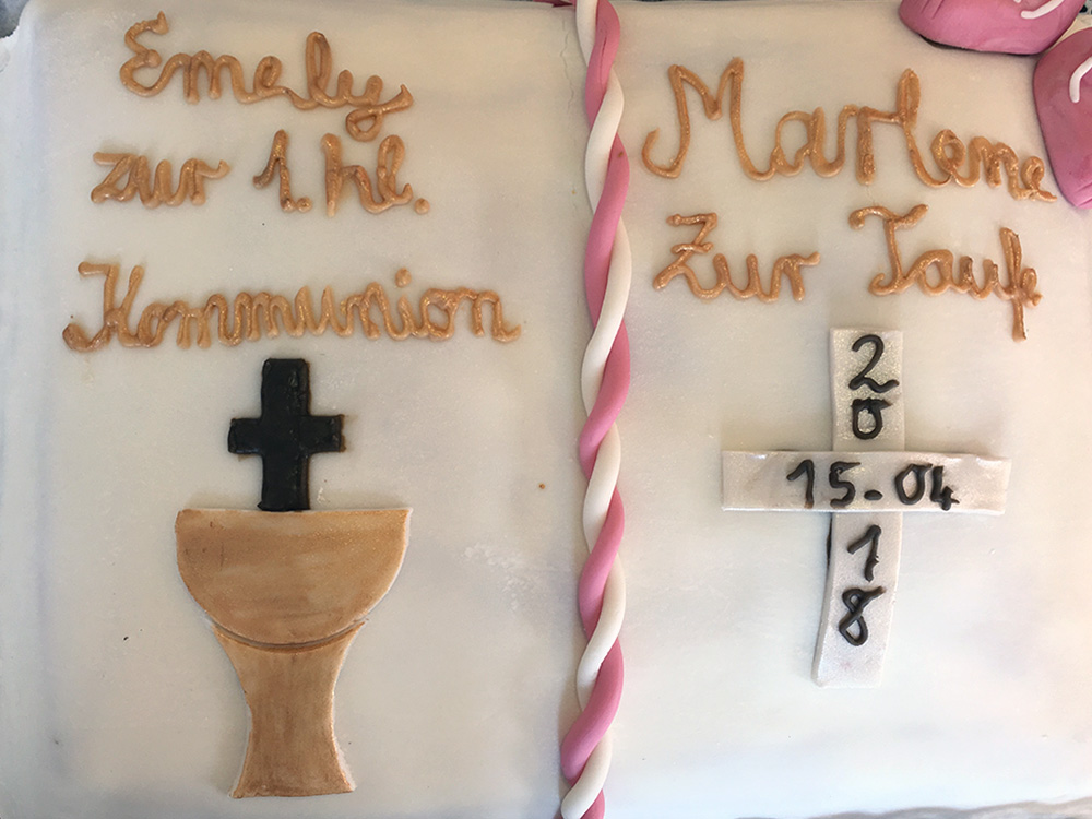 Ein so emotionaler Anlass wie die Taufe eines Familienmitglieds verdient eine Torte, die alles stilvoll abrundet. Ob fruchtigfrisch, cremig-zart oder intensiv schokoladig – wir beraten Sie gerne persönlich und setzen Ihre Wünsche mit viel Fingerspitzengefühl um – natürlich auch allergikerfreundlich.